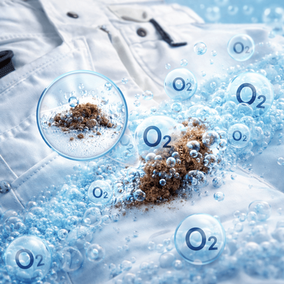 When dissolved in water, the active oxygen formula supports the detergent by penetrating fabric fibers and breaking down dirt particles. This allows stains to be removed more effectively at standard washing temperatures, without mechanical stress on the material.